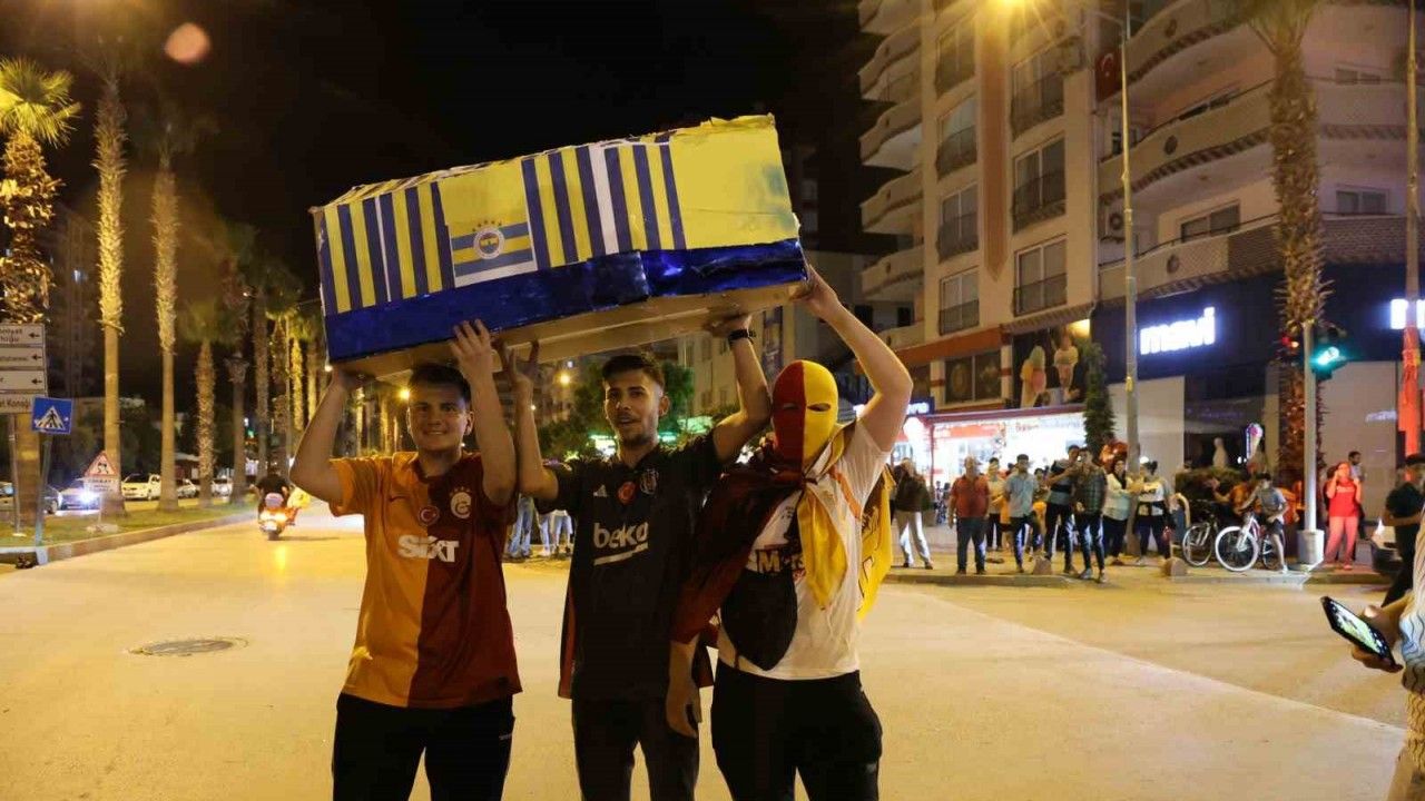 Şampiyonluğunu ilan eden Galatasaray’ın Adana Kozan’daki bazı taraftarları, Fenerbahçe bayrağını tabuta sararak davul zurna ile kutlama yaptı.