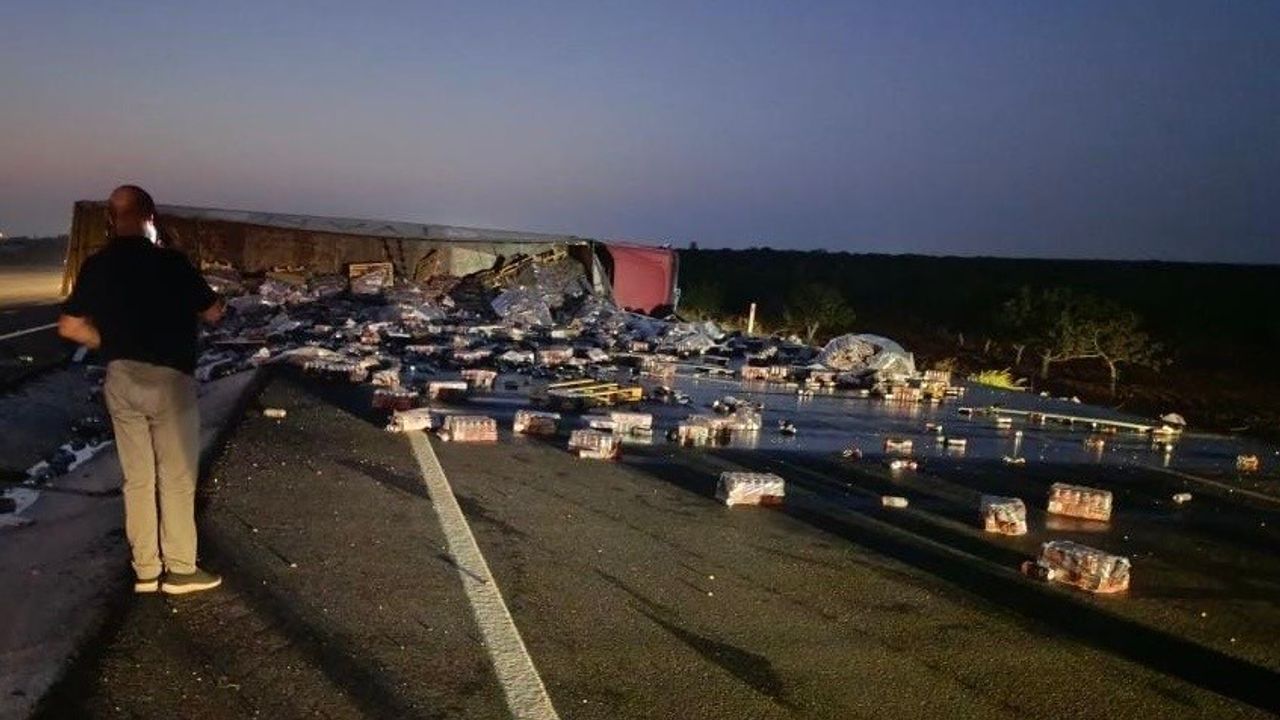 Gaziantep’te direksiyon hakimiyeti kaybolduktan sonra devrilen meşrubat yüklü tırın sürücüsü yaralandı.