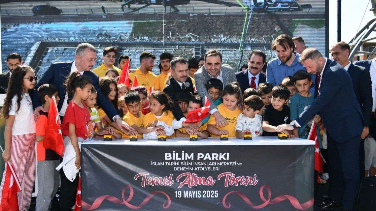 Bilim Parkı-İslam Tarihi Bilim İnsanları Merkezi ve Deneyim Atölyeleri Projesi’nin temel atma töreni, protokol üyelerinin ve sahneye çıkan çocukların butona basmasıyla sona erdi.