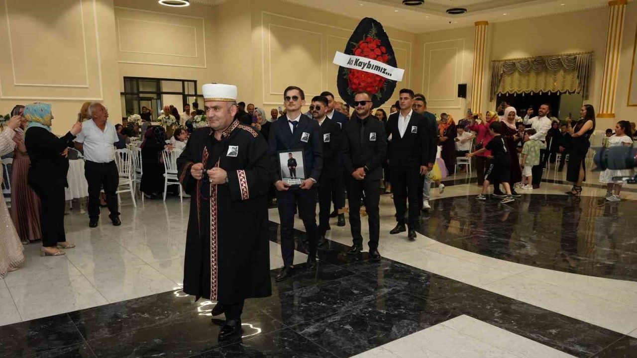 Gelin ve damadın mesai arkadaşları salona "Acı kaybımız" yazılı çelenk ve temsili imam ile girdi, salondakiler gülmekten kırıldı.
