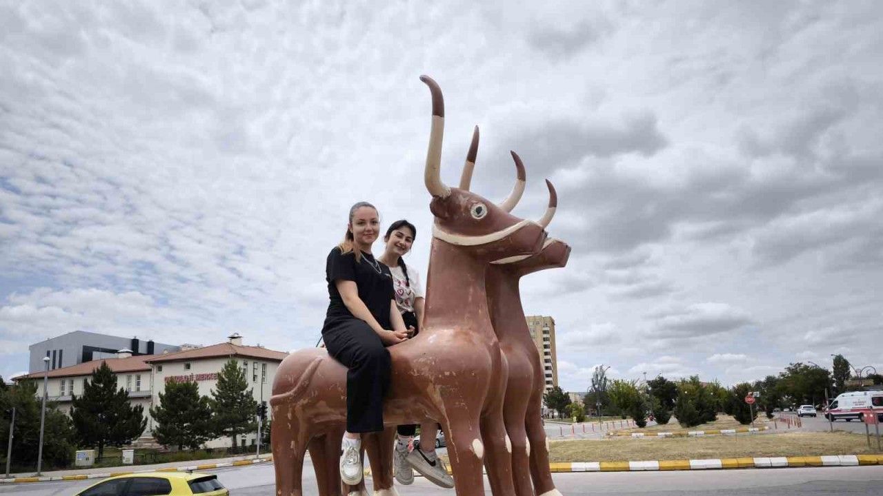 Sivas’ta üniversiteden mezun olan iki arkadaş, kampüs girişinde bulunan ‘Hurri ve Şerri’ heykeline çıktı. Sarissa Antik Kenti kazısında bulunan ve benzeri yapılarak Cumhuriyet Üniversitesi girişinde sergilenen heykele çıkan kızlar, şehri daha yüksekten görmek istediklerini söyledi.