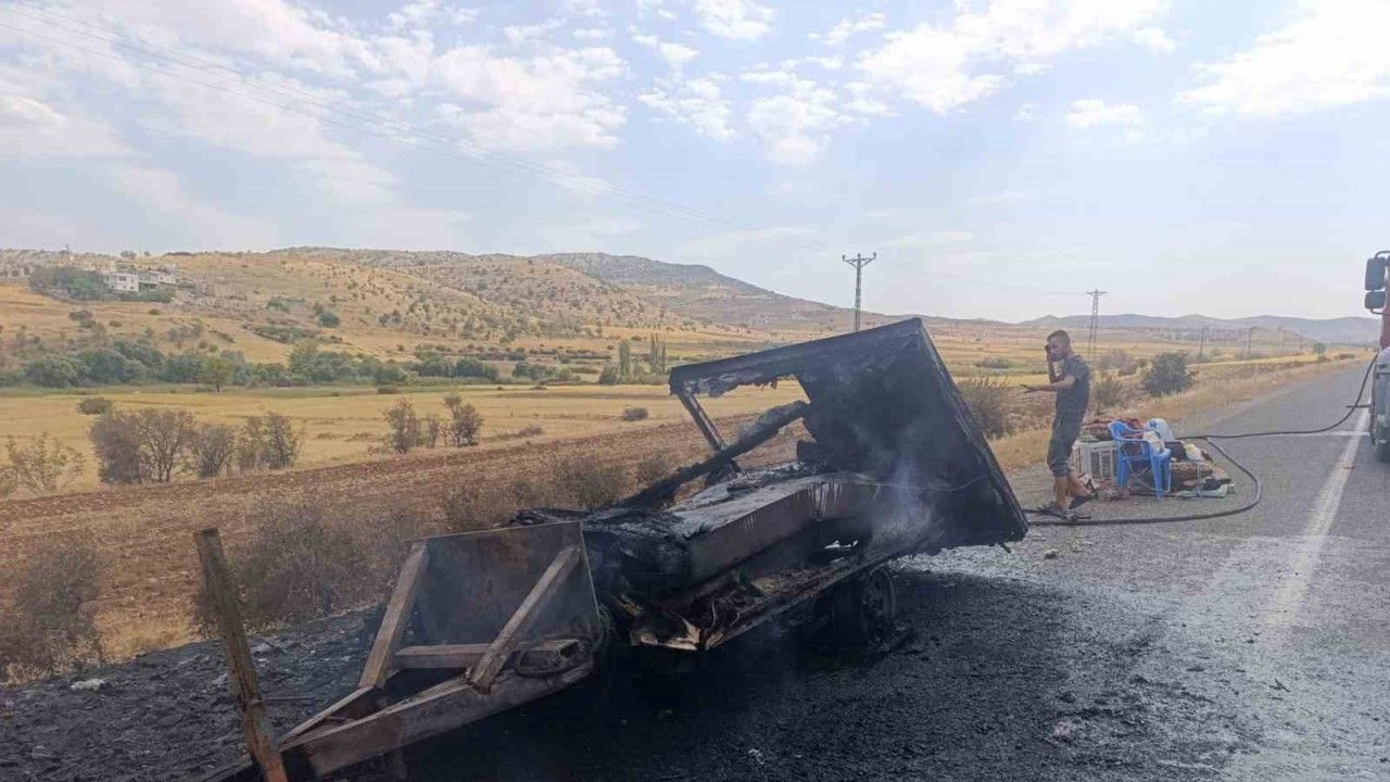 Batman’ın Gercüş ilçesinde seyir halindeki kamyonetin arkasında bulunan çekme karavan, yanarak kullanılamaz hale geldi.