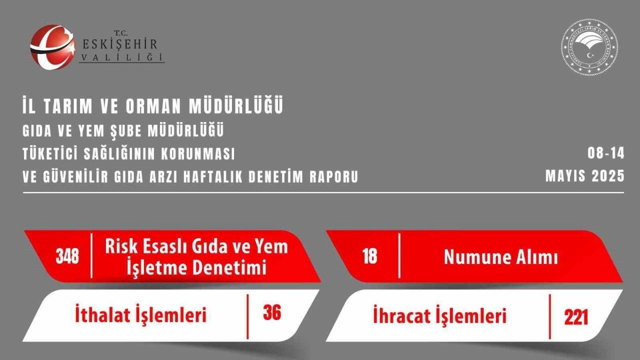 Eskişehir Valiliği, İl Tarım ve Orman Müdürlüğü Gıda ve Yem Müdürlüğü ekiplerince 8-14 Mayıs 2025 tarihleri arasında yapılan çalışmalarla ilgili verileri paylaştı. Tüketici sağlığının korunması ve güvenilir gıda arzı haftalık denetim raporunda yer alan bilgilere göre; 348 risk esaslı gıda ve yem işletme denetimi, 36 ithalat işlemleri, 18 numune alımı ile 221 ihracat işlemleri gerçekleştirildi. Ekiplerin çalışmaları sonucunda, 4 idari yaptırım ve 2 milyon 381 bin 979 TL para cezası uygulanırken, 1 toplatma kararı alındığı belirtildi.