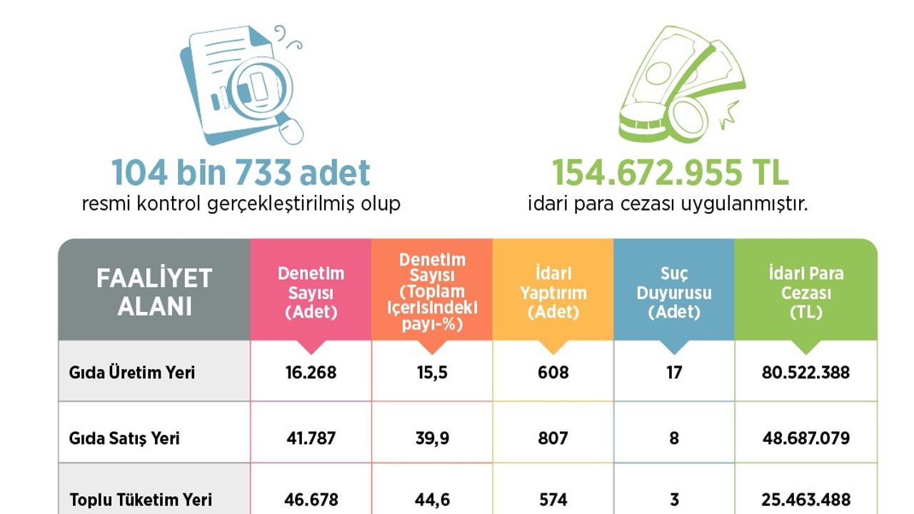 "104 bin 733 gıda işletmesinde denetim yapıldı. Bin 989 idari yaptırım uygulandı. Toplamda 154 milyon 672 bin 955 lira idari para cezası uygulandı. 28 gıda işletmecisi hakkında Cumhuriyet Savcılığı’na suç duyurusunda bulunuldu. Vatandaşlarımızın güvenilir gıdaya erişimi için denetimler kararlılıkla sürdürülmektedir."