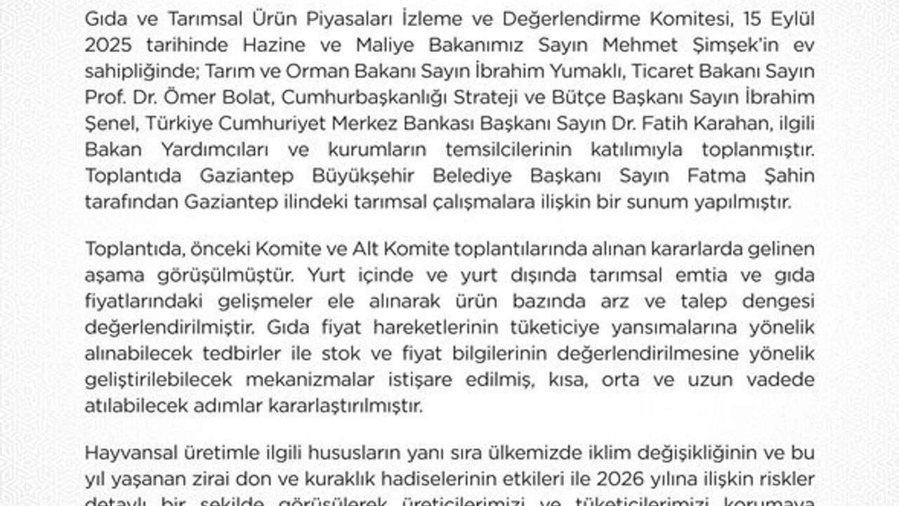 Toplantının ardından Hazine ve Maliye Bakanlığı’nın sosyal medya hesabından yapılan açıklamada, "Gıda ve Tarımsal Ürün Piyasaları İzleme ve Değerlendirme Komitesi, 15 Eylül 2025 tarihinde Hazine ve Maliye Bakanımız Sayın Mehmet Şimşek’in ev sahipliğinde Tarım ve Orman Bakanı Sayın İbrahim Yumaklı, Ticaret Bakanı Sayın Prof. Dr. Ömer Bolat, Cumhurbaşkanlığı Strateji ve Bütçe Başkanı Sayın İbrahim Şenel, Türkiye Cumhuriyet Merkez Bankası Başkanı Sayın Dr. Fatih Karahan, ilgili bakan yardımcıları ve kurumların temsilcilerinin katılımıyla toplanmıştır. Toplantıda Gaziantep Büyükşehir Belediye Başkanı Sayın Fatma Şahin tarafından Gaziantep ilindeki tarımsal çalışmalara ilişkin bir sunum yapılmıştır" denildi.