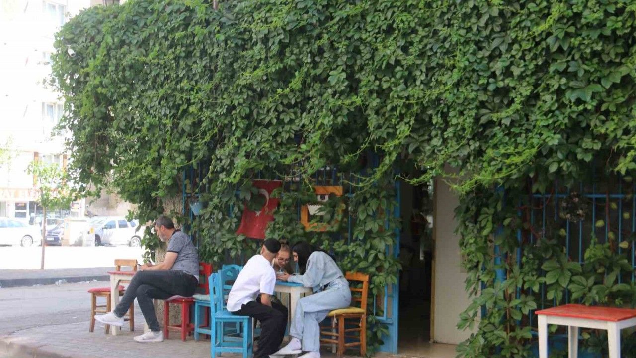 Sivas’ta binaların arasında sarmaşıklarla çevrelenmiş kafe görenlerin ilgisini çekiyor. Kafeye gelen müşteriler fotoğraf çekilerek keyifli vakit geçiriyor.