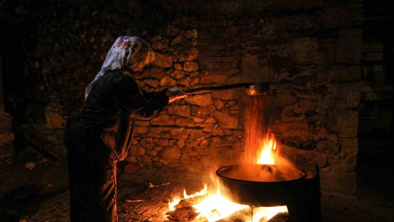 Manisa’nın Gördes ilçesine bağlı Güneşli Mahallesinde, kahvaltılarda sofraları süsleyen pekmez yapımı için gece gündüz kazanlar kaynatılıyor.