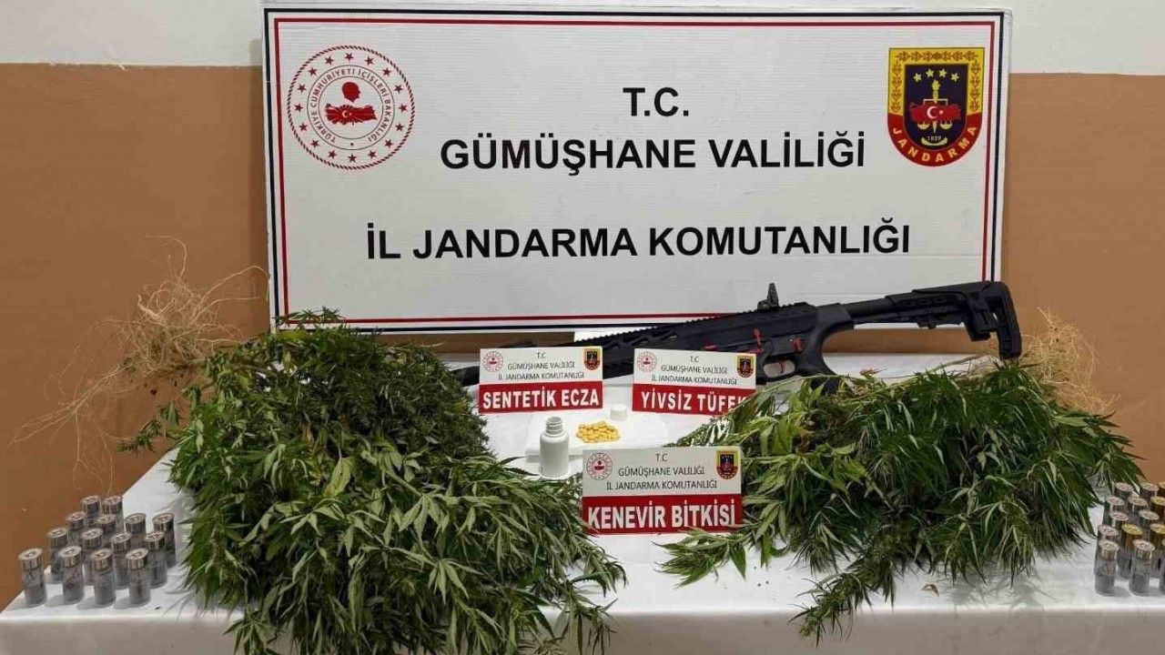 Gümüşhane İl Jandarma Komutanlığı ekiplerinin düzenlediği 2 ayrı operasyonda sahte içki yapımında kullanılan etil alkol, ekili kenevir, sentetik ecza ve ruhsatsız silah ele geçirildi. Olaylarla ilgili iki şüpheli hakkında adli tahkikat başlatıldı.