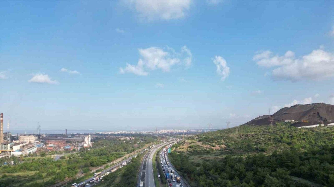 Hatay’da heyelan nedeniyle kapanan Toprakkale-İskenderun Otoyolu’nda oluşan kilometrelerce uzunluğundaki araç kuyruğu dron ile havadan görüntülendi.