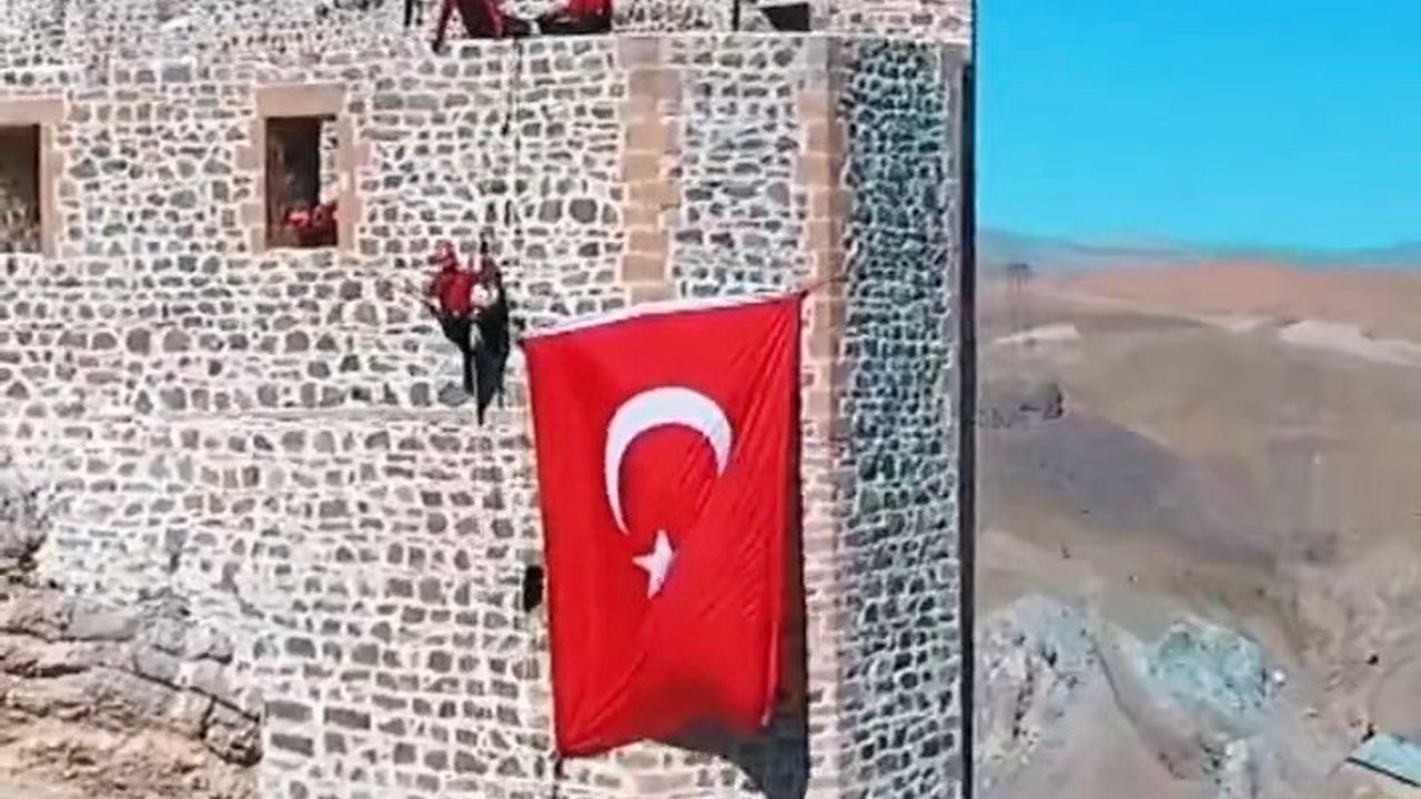 Hoşap Kalesi’nde rüzgârın zarar verdiği Türk bayrağı, jandarma ekiplerinin müdahalesiyle yeniden surlara asıldı.