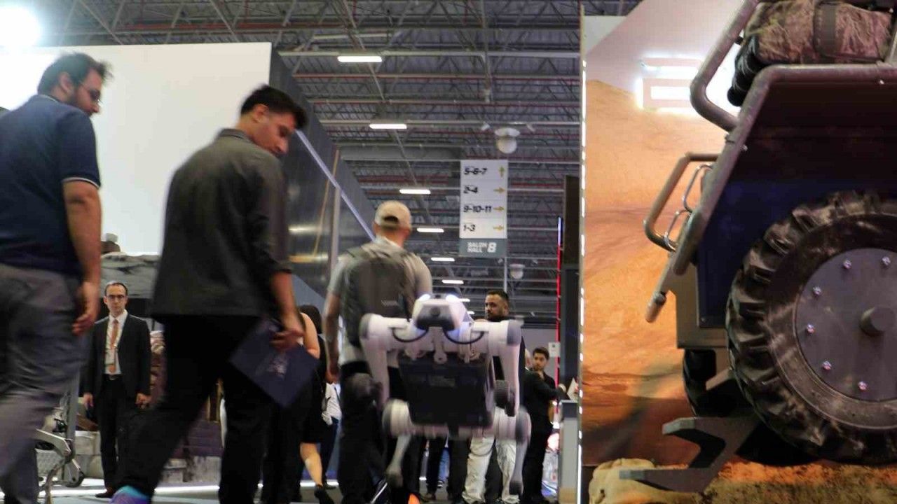 IDEF’te sergilenen dört ayaklı insansız kara aracı olan robot köpekler, hem zıplıyor, hem takla atıyor hem de selam veriyor. Robot köpeklere ziyaretçiler yoğun ilgi gösterdi.