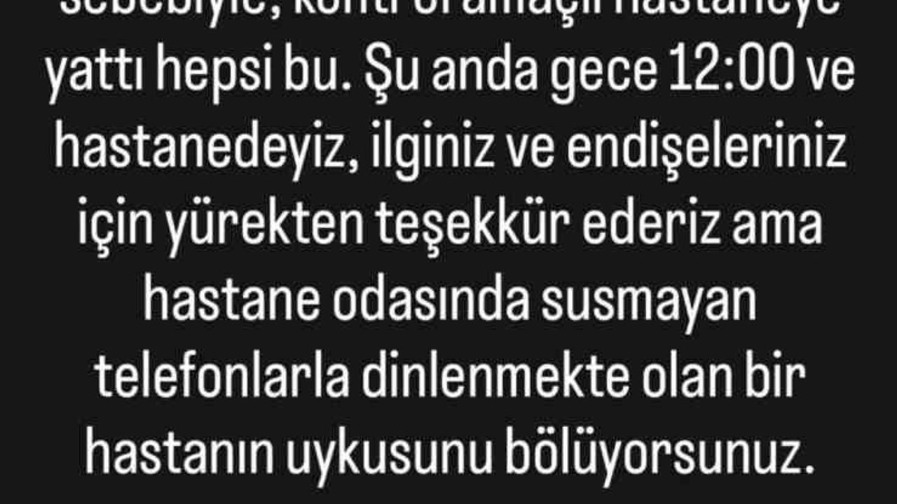"Babam kalp krizi geçirmedi, yoğun bakımda da değil, ufak bir rahatsızlık sebebiyle, kontrol amaçlı hastaneye yattı hepsi bu. Şu anda gece 12:00 ve hastanedeyiz, ilginiz ve endişeleriniz için yürekten teşekkür ederiz ama hastane odasında susmayan telefonlarla dinlenmekte olan bir hastanın uykusunu bölüyorsunuz."