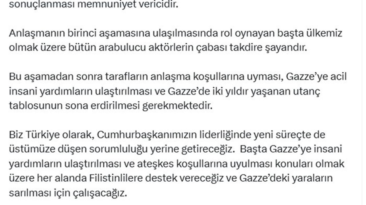 Cumhurbaşkanlığı İletişim Başkanı Burhanettin Duran, yaptığı paylaşımda Gazze’de ateşkes anlaşmasının birinci aşamasına ulaşılmasında rol oynayan başta Türkiye olmak üzere tüm arabulucu aktörlerin çabalarının takdire şayan olduğunu ifade etti. Duran, tarafların anlaşma koşullarına uyması gerektiğini vurgulayarak, Gazze’ye acil insani yardımların ulaştırılması ve iki yıldır süren insanlık dramının sona erdirilmesi çağrısında bulundu. Cumhurbaşkanı Recep Tayyip Erdoğan’ın liderliğinde Türkiye’nin yeni süreçte de üzerine düşen sorumluluğu yerine getireceğini belirten Duran, "Başta Gazze’ye insani yardımların ulaştırılması ve ateşkes koşullarına uyulması olmak üzere her alanda Filistinlilere destek vereceğiz ve Gazze’deki yaraların sarılması için çalışacağız" ifadelerini kullandı.