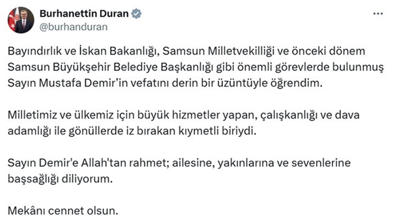 Sosyal medya hesabından paylaşımda bulunan Duran, "Bayındırlık ve İskan Bakanlığı, Samsun Milletvekilliği ve önceki dönem Samsun Büyükşehir Belediye Başkanlığı gibi önemli görevlerde bulunmuş Sayın Mustafa Demir’in vefatını derin bir üzüntüyle öğrendim" ifadelerini kullandı.