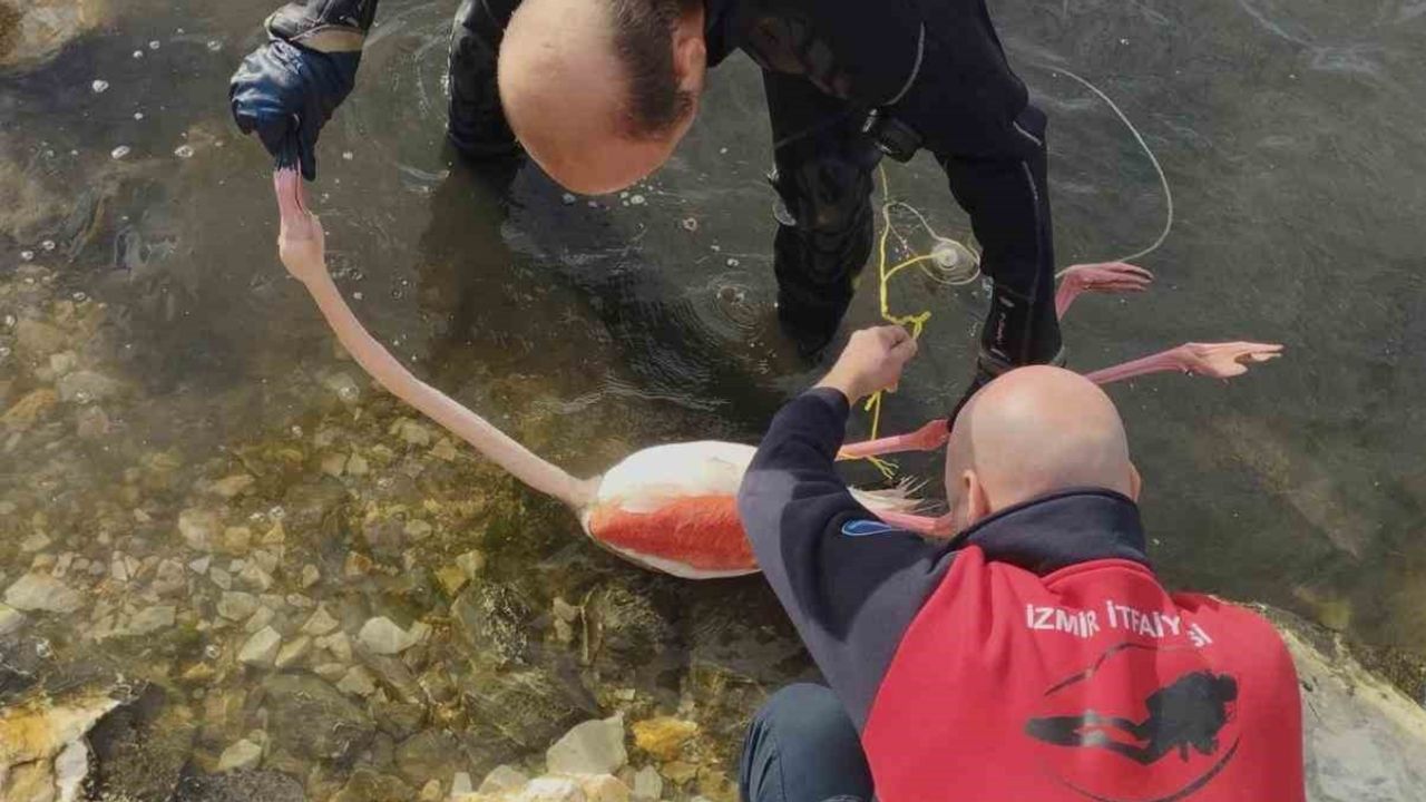 Deniz kenarında mahsur kalan flamingo için gelen ihbar üzerine harekete geçen Su Altı ve Su Üstü Arama Kurtarma Birimi, yaklaşık 15 dakikalık titiz bir çalışmayla kuşun vücuduna dolanan ipleri çıkardı. İlk kontrollerde sağlık durumunun iyi olduğu belirlenen flamingo, yeniden doğal yaşam alanına salındı.