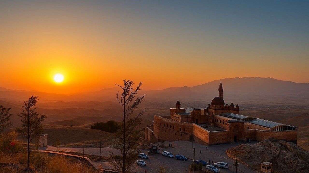 Ağrı’nın Doğubayazıt ilçesinde bulunan tarihi İshak Paşa Sarayı, gün batımı manzarasıyla ziyaretçilerini mest etti.