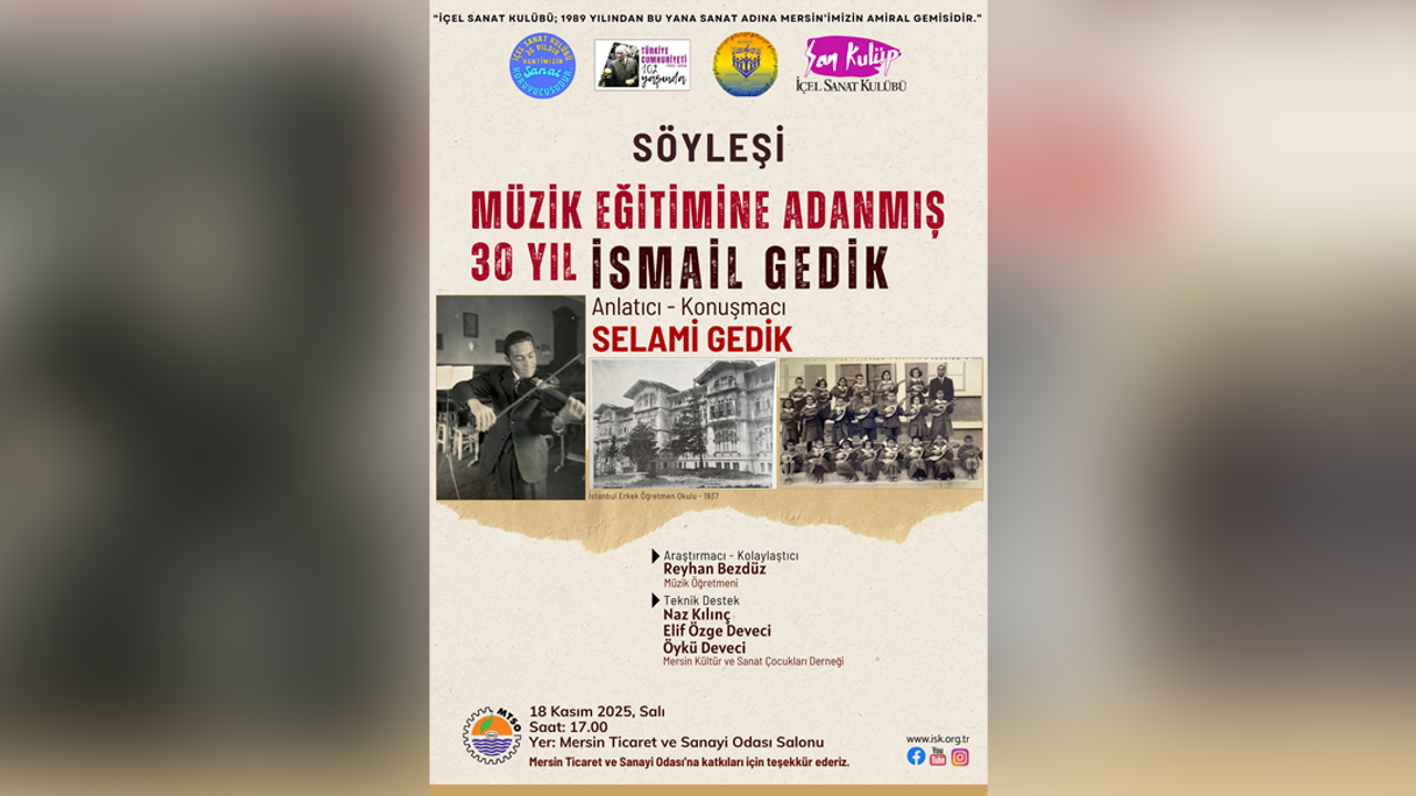 Mersin’in kültür ve sanat yaşamına katkı sunan İçel Sanat Kulübü (İSK), önemli bir söyleşi ile sanatseverlerle buluşuyor. Kulüp, 18 Kasım 2025 Salı günü, müzik eğitimine yaptığı katkılarla tanınan İsmail Gedik’in 30 yıllık mesleki serüveni ve yaşam öyküsünü konu alan özel bir program düzenliyor.