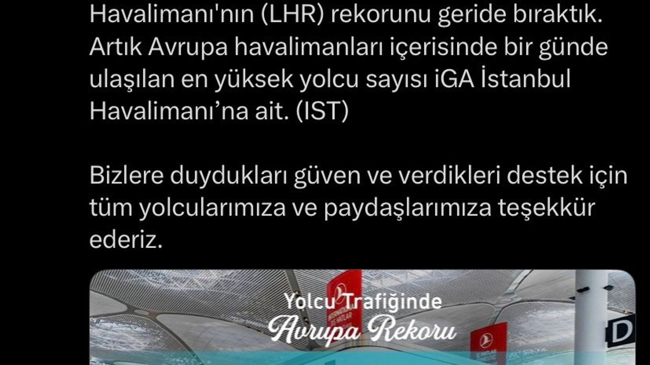 İstanbul Havalimanı’nın ulaştığı bu başarı, İGA’nın sosyal medya hesabından paylaşıldı. X platformundan yapılan paylaşımda, "25 Temmuz 2025 tarihinde, bir günde toplam 271 bin 836 yolcuya hizmet vererek Avrupa’nın günlük yolcu rekorunu kırdık! Bu başarıyla birlikte, daha önce 30 Haziran 2024 tarihinde 268 bin yolcuyla bu alandaki liderliği elinde bulunduran Londra Heathrow Havalimanı’nın (LHR) rekorunu geride bıraktık. Artık Avrupa havalimanları içerisinde bir günde ulaşılan en yüksek yolcu sayısı iGA İstanbul Havalimanı’na ait. (IST) Bizlere duydukları güven ve verdikleri destek için tüm yolcularımıza ve paydaşlarımıza teşekkür ederiz" ifadelerine yer verildi.