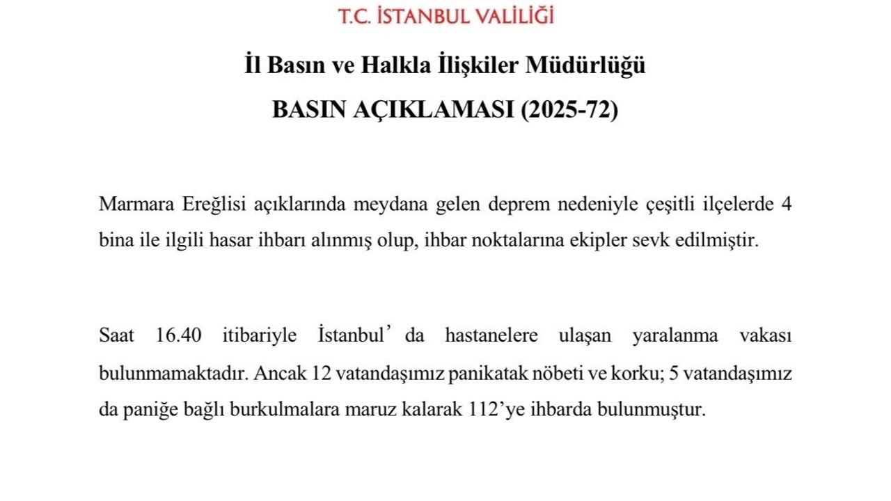 Marmara’da saat 14.55’te 5 büyüklüğünde deprem meydana gelirken İstanbul’un birçok noktasında vatandaşlar kendilerini dışarı attı. İstanbul Valiliği yaptığı açıklamada, "Marmara Ereğlisi açıklarında meydana gelen deprem nedeniyle çeşitli ilçelerde 4 bina ile ilgili hasar ihbarı alınmış olup, ihbar noktalarına ekipler sevk edilmiştir. Saat 16.40 itibariyle İstanbul’da hastanelere ulaşan yaralanma vakası bulunmamaktadır. Ancak 12 vatandaşımız panikatak nöbeti ve korku; 5 vatandaşımız da paniğe bağlı burkulmalara maruz kalarak 112’ye ihbarda bulunmuştur" ifadelerini kullandı.