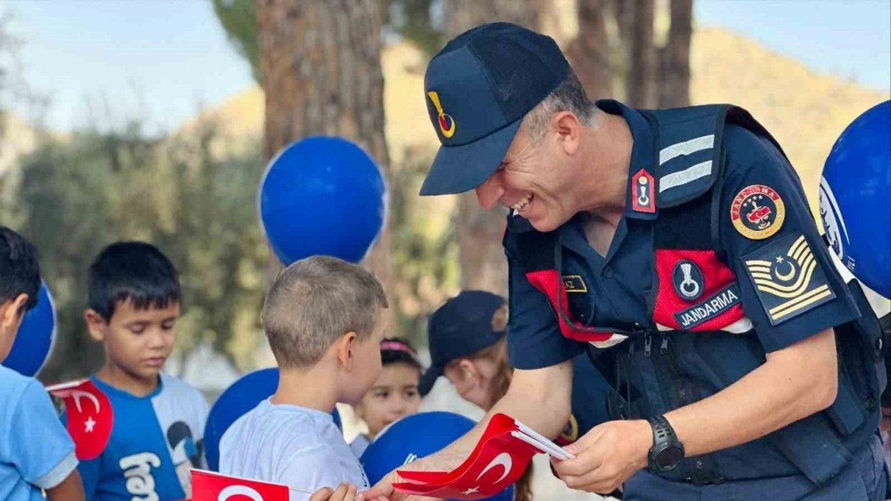 Aydın’ın İncirliova ilçesinde jandarma ekipleri öğrencilerle bir araya gelerek bilgilendirmede bulunarak, Türk bayrağı ve balon hediye etti.