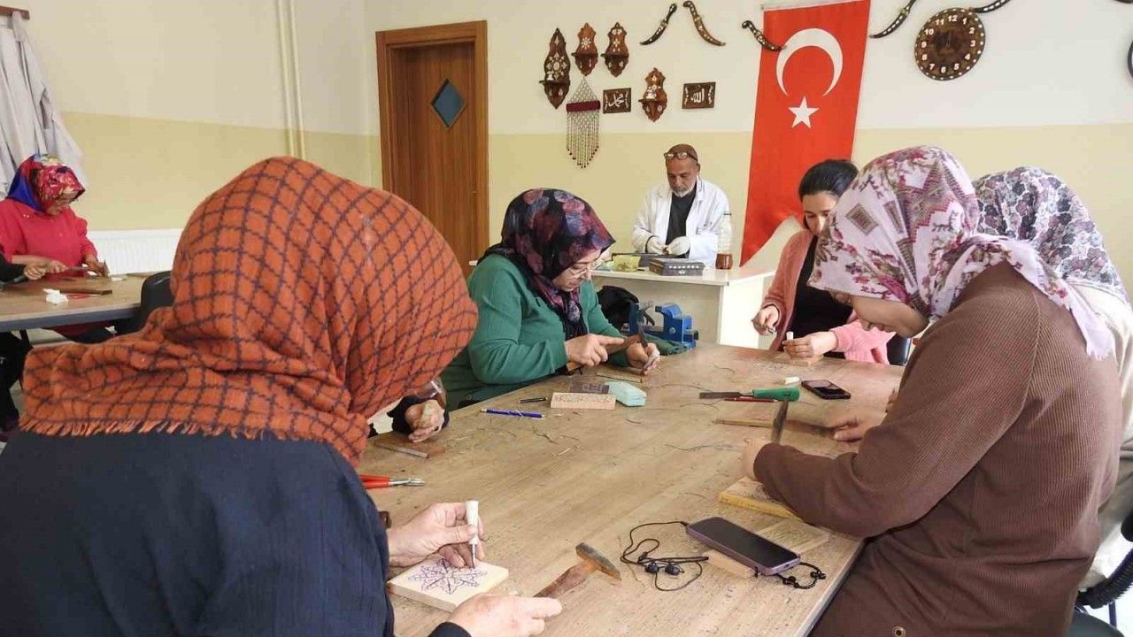 Şahinbey Belediyesi’ne bağlı Hasan Celal Güzel Gençlik Merkezi’nde sedef kakma kursuna katılan kadınlar, hünerli elleriyle birbirinden güzel ahşap işlemeler yapıyor.