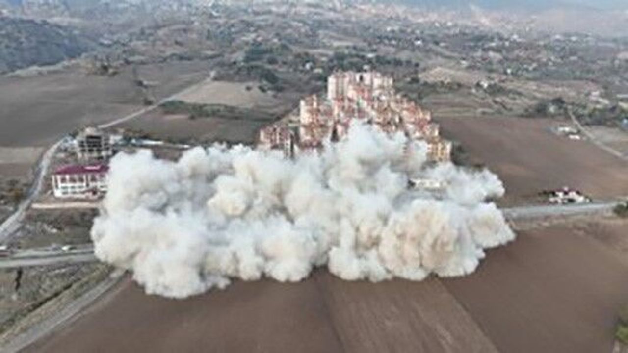 Kahramanmaraş merkezli depremler sonrası ağır hasar raporu verilen binalar patlayıcı ile yıkılıyor.