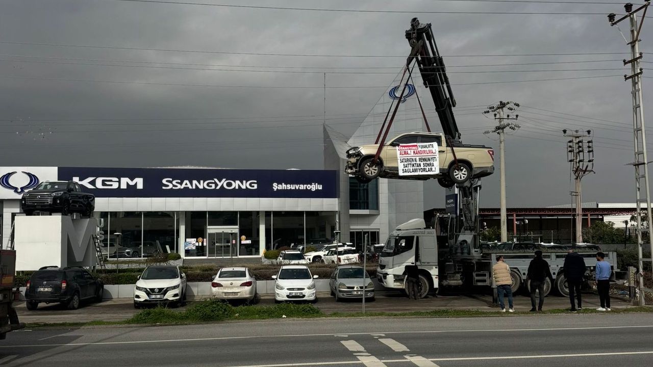 İddiaya göre, bir firma 2024 yılının Mart ayında SsangYong'un sıfır kilometre kamyonetini satın aldı. Şirketin sahibi, 100 bin kilometreye kadar ücretsiz bakım olduğu için en son 94 bin kilometrede araca bakım yaptırdı. Yapılan bakımda motor kısmında da herhangi bir sorun görülmedi. Ancak araç 101 bin kilometreye geldiğinde motor arızası verdi. Kamyonet firmaya tamire götürüldüğünde motorunun tamamen çalışamaz halde olduğu bilgisi verildi. Firma aracın 6 bin kilometre önce bakıma getirildiğini ancak herhangi bir arızasının çıkmadığını, bu nedenle motorda meydana gelen arızada firmanın kusurlu olduğunu ileri sürerek yapılmasını ya da yeni motor verilmesini talep etti. Ancak SsangYong firması bu durumu kabul etmedi. Bunun üzerine aracı satın aldığı Kavaklı Mahallesi Turhan Cemal Beriker Bulvarı'ndaki SsangYong araç bayisine gelen firma yetkilileri, kamyoneti vinçle asarak eylem yaptı. Vatandaşlar, aracın üzerine de 'Alma, kandırılma. Satarken gösterilen memnuniyet, satıştan sonra sağlanmıyor' yazılı pankart asarak sergiledi. Bir süre sonra eylem sonlandırıldı.