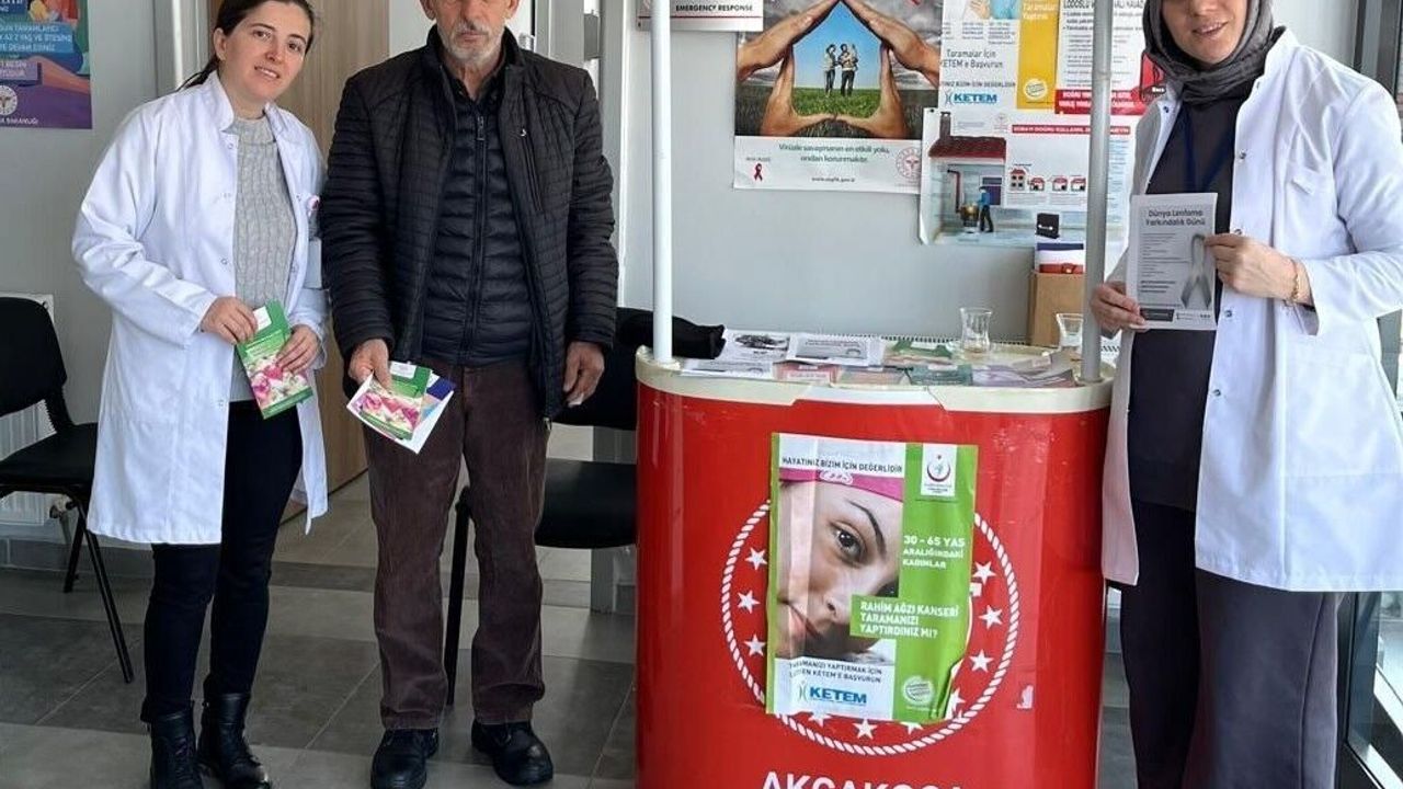 Düzce’nin Akçakoca ilçesinde İlçe Sağlık Müdürlüğü tarafından Orhan Özdemir Aile Sağlığı Merkezinde sağlıkçılar stant açtı. Ekipler, kanser hastalığına karşı farkındalık oluşturmak ve kanserle mücadelede taramalara katılımı artırmak amacıyla açtıkları stantta kanser taramaları, çocukluk çağı kanserleri, sigara bırakma konularında bilgilendirme yapılmış ve broşür dağıtımı gerçekleştirildiler.