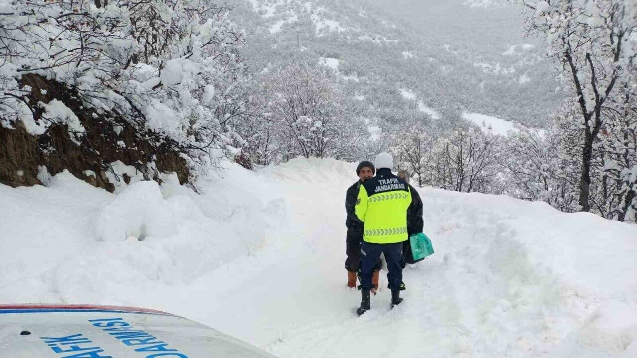 Pülümür ilçe merkezine 23 kilometre mesafede bulunan Akdik Köyü’nde yaşayan Fatma Akalt, yoğun kar yağışı nedeniyle hastaneye gidemeyince kaymakamlıktan yardım talep etti. Talep üzerine devreye giren İlçe Jandarma Komutanlığı trafik ekibi, yaşlı kadını köyden alarak Pülümür Toplum Sağlığı Merkezi’ne ulaştırdı.