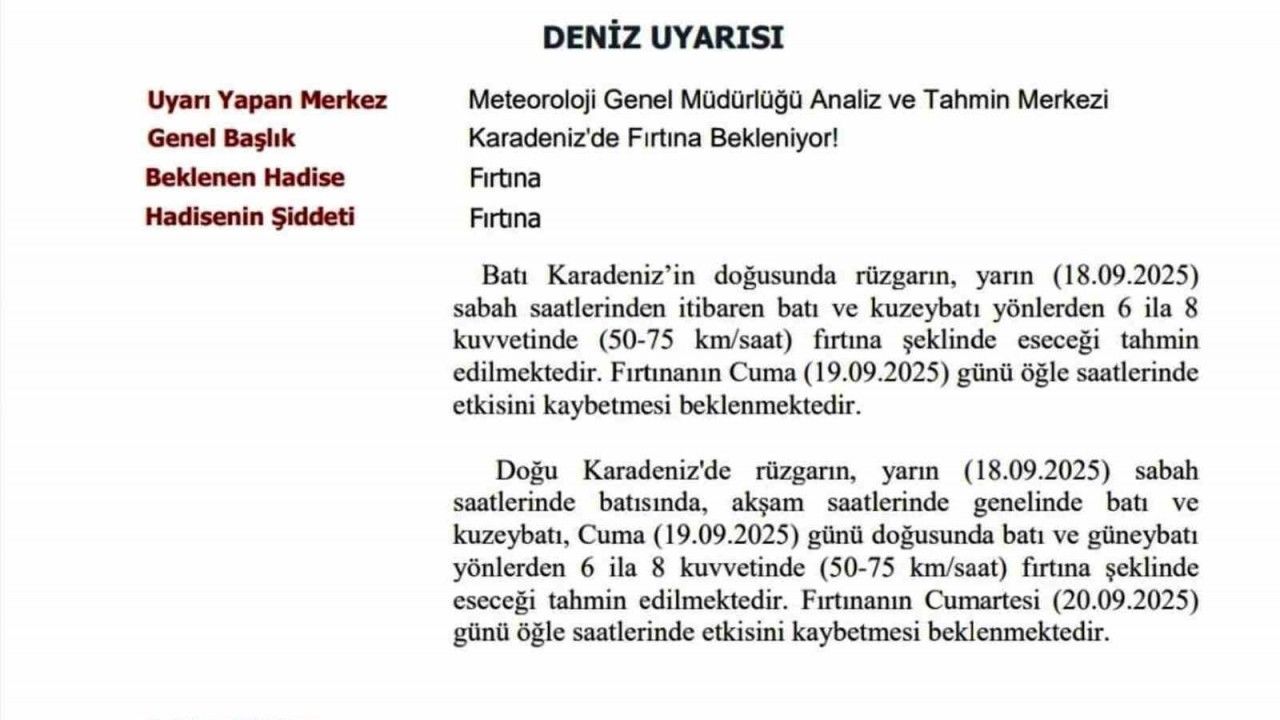 MGM Analiz ve Tahmin Merkezi tarafından ’Deniz Uyarısı’ başlığıyla yapılan uyarıda Batı Karadeniz’in doğusunda rüzgarın, yarın (18.09.2025) sabah saatlerinden itibaren batı ve kuzeybatı yönlerden 6 ila 8 kuvvetinde (50-75 km/saat) fırtına şeklinde eseceğinin tahmin edildiği belirtildi. Fırtınanın cuma (19.09.2025) günü öğle saatlerinde etkisini kaybetmesinin beklendiği ifade edildi.