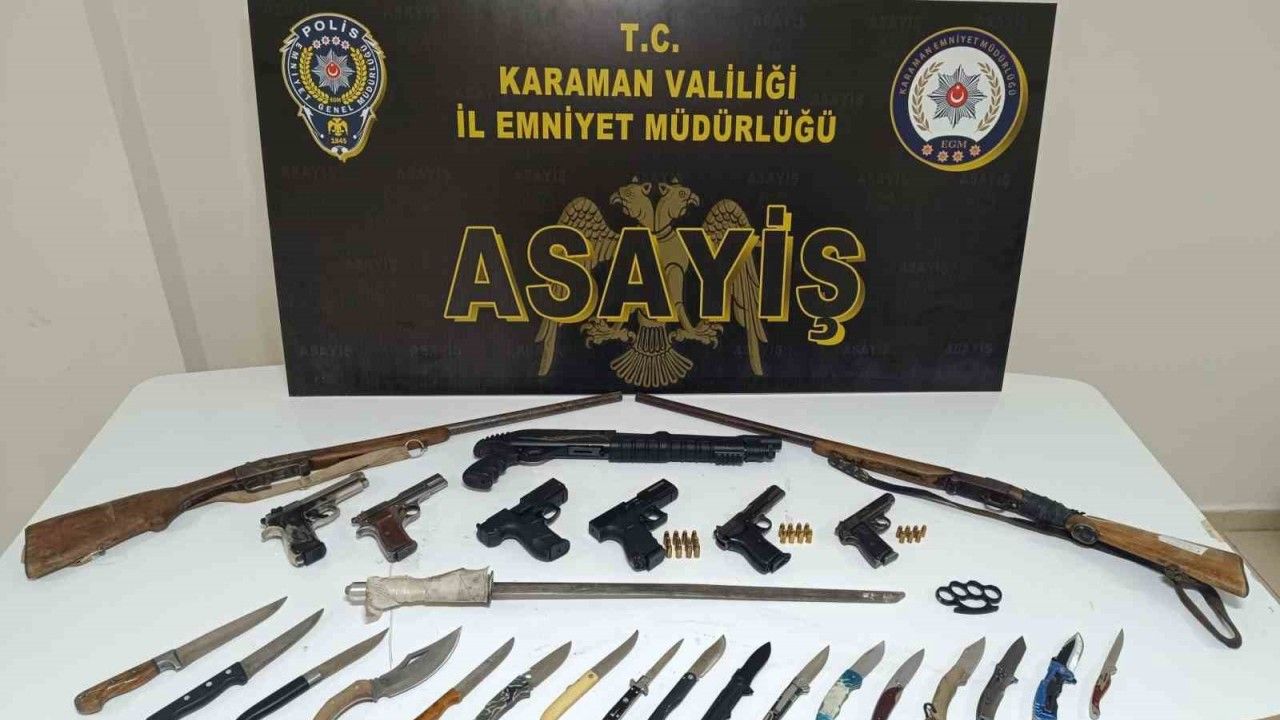 Karaman’da asayiş uygulamalarında uyuşturucu, bıçaklar ve ruhsatsız silahlar ele geçirilirken, çeşitli suçlardan aranan 4 şahıs tutuklandı.