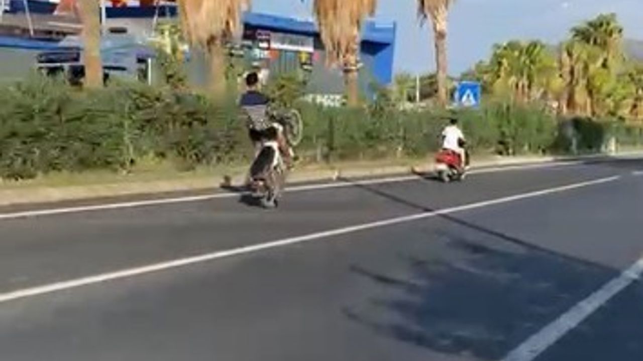 Antalya’nın Gazipaşa ilçesinde kasksız motosiklet sürücüsü, D-400 Karayolu’nda motosikletin ön tekerini kaldırarak ilerledi. Hem kendi canını hem de trafiği tehlikeye atan sürücünün o anları cep telefonu kamerasına yansıdı.