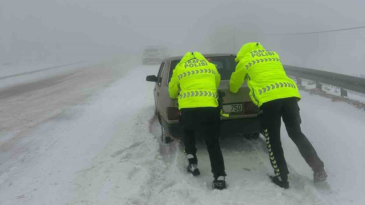 Hatay'da etkili olan kar yağışı sonrası araçlarıyla yollarda mahsur kalan vatandaşlara polis ekipleri yardım etti.