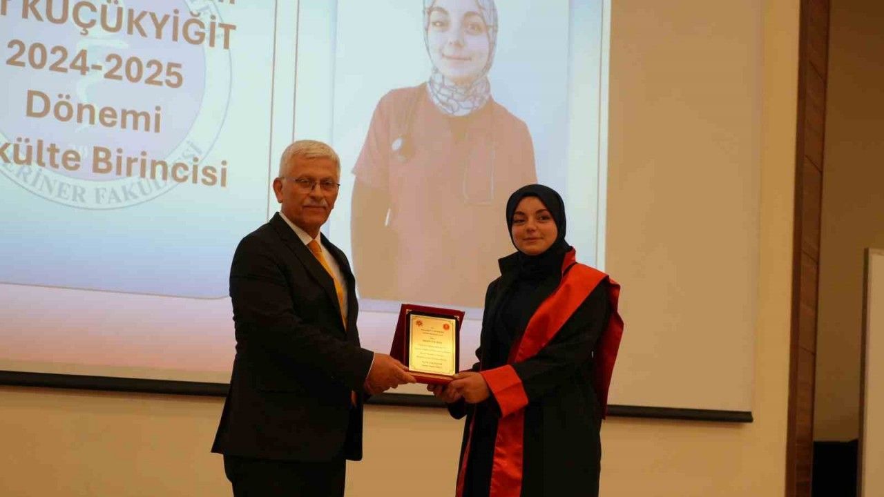 Konuşmaların ardından fakülte birincisi Elif Küçükyiğit, yaş kütüğüne plaketini çaktı. Ardından fakülte birincisi Elif Küçükyiğit, fakülte ikincisi İsa Şekercioğlu, fakülte üçüncüsü Bilge Çakmakoğlu ile mezun olan 48 veteriner hekime, protokol üyeleri tarafından plaket takdim edilerek, rozetlerini taktı.