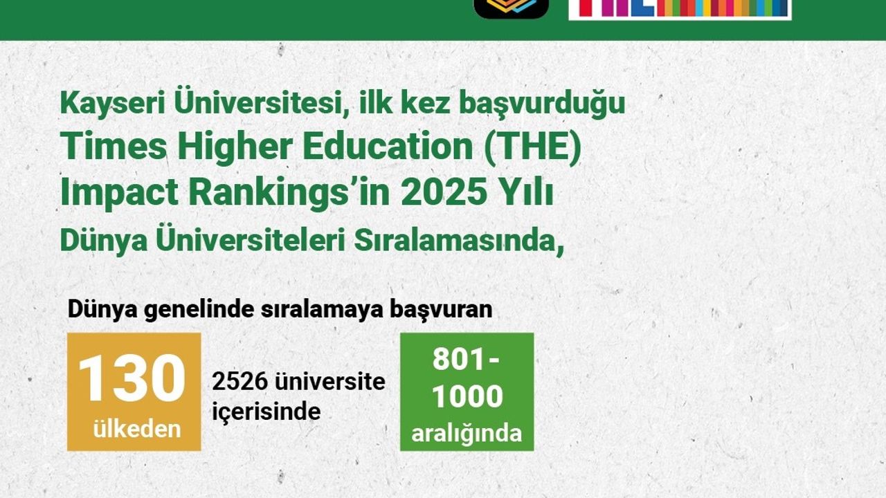 Kayseri Üniversitesi (KAYÜ), 2025 yılı Times Higher Education (THE) Impact Rankings’a ilk kez başvurarak toplamda 100 üzerinden 61.9 puan aldı.