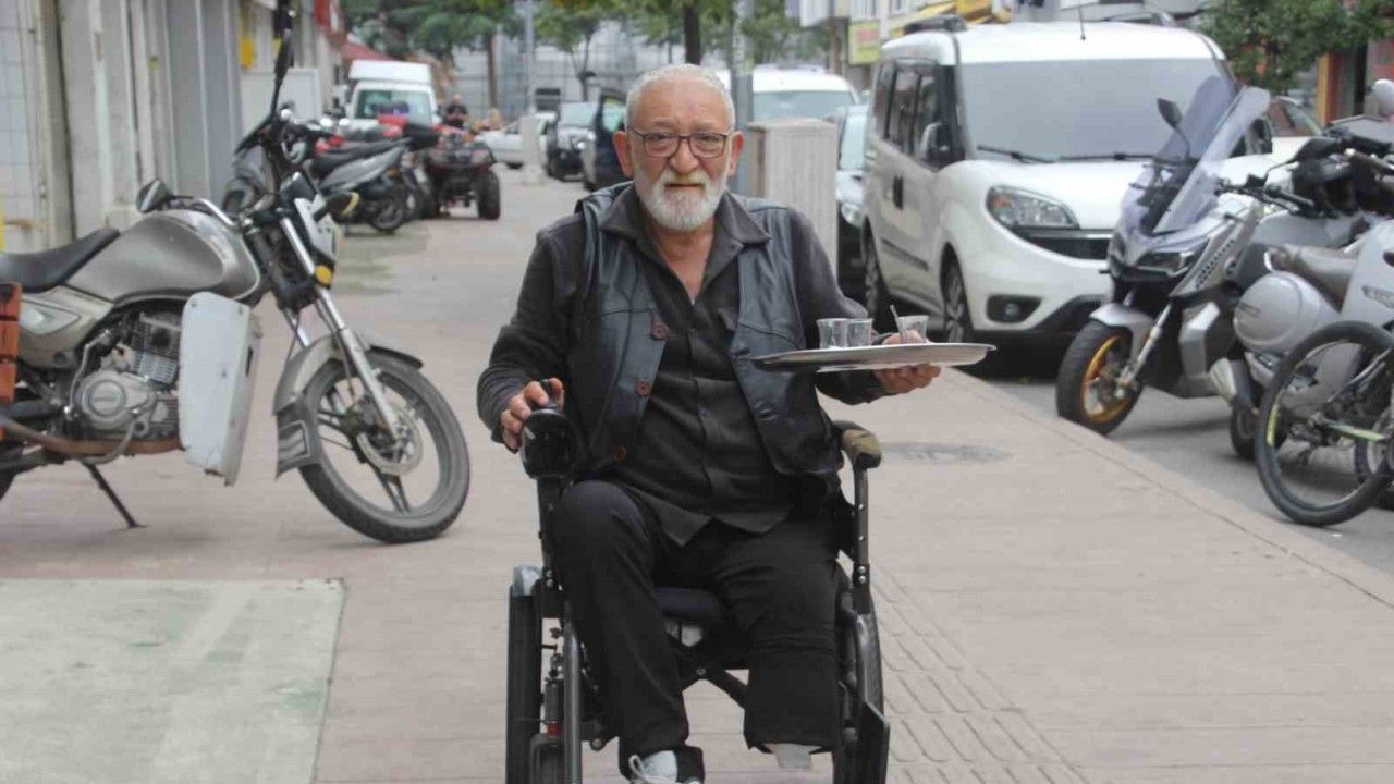 Ordu’da yaklaşık 50 yıldan bu yana çay ocağı işleten Şahin Çakır, geçirdiği trafik kazası sonrası sol bacağı dizden aşağı kesilince mesleğini akülü tekerlekli sandalye ile devam ettiriyor.