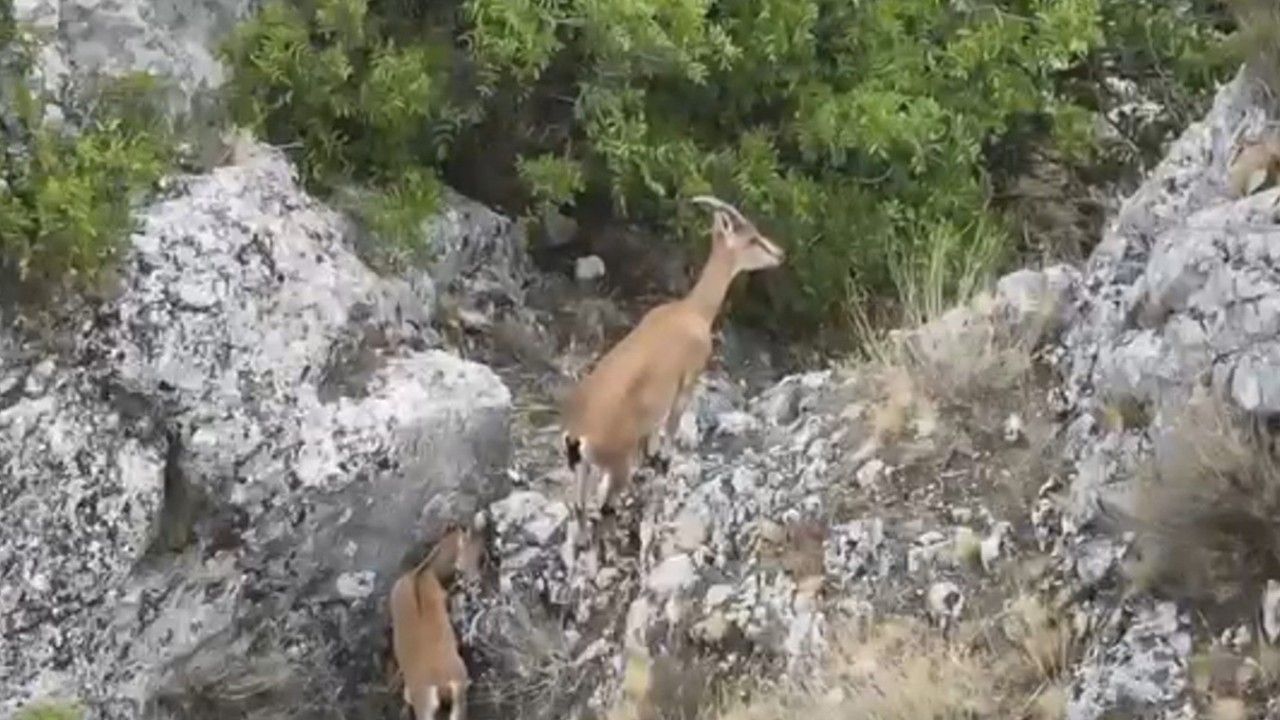 Dronla kaydedilen görüntülerde, keçilerin yavrularıyla birlikte sarp kayalıklarda ve yeşil alanlarda özgürce dolaştığı anlar yer alıyor. Yetkililer, keçi popülasyonunun her geçen gün arttığını ve bölgedeki biyolojik çeşitliliğe olumlu katkı sağladığını belirtti.