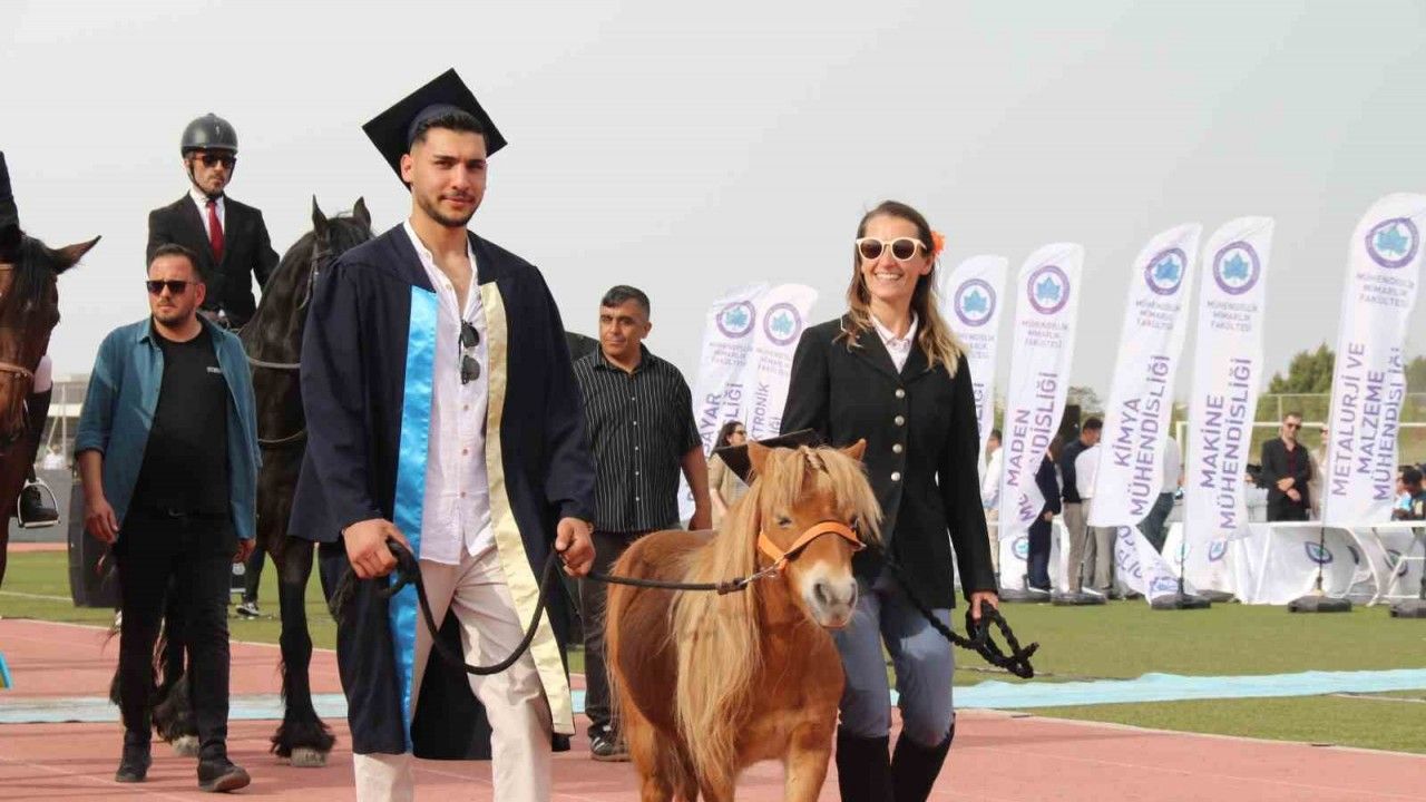 Eskişehir Osmangazi Üniversitesi Meşelik Kampüsü’nde mezuniyet töreni düzenlendi. Törende yaklaşık 4 bin 500 öğrenci ile farklı şehirlerden gelen yakınları ESOGÜ Stadyumu’nu doldurdu. Alana ESOGÜ Mahmudiye Atçılık Meslek Yüksekokulu Binicilik ve Atlı Terapi Merkezi’nden getirilen shetland cinsi kısa boylu at ise bütün dikkatleri üzerine çekti. Başında kepi de bulunan 13 yaşındaki atla öğrenciler bol bol fotoğraf çekindi. Her yıl öğrencilerle birlikte mezuniyet törenine katılan at, daha sonra tören alanından ayrıldı.