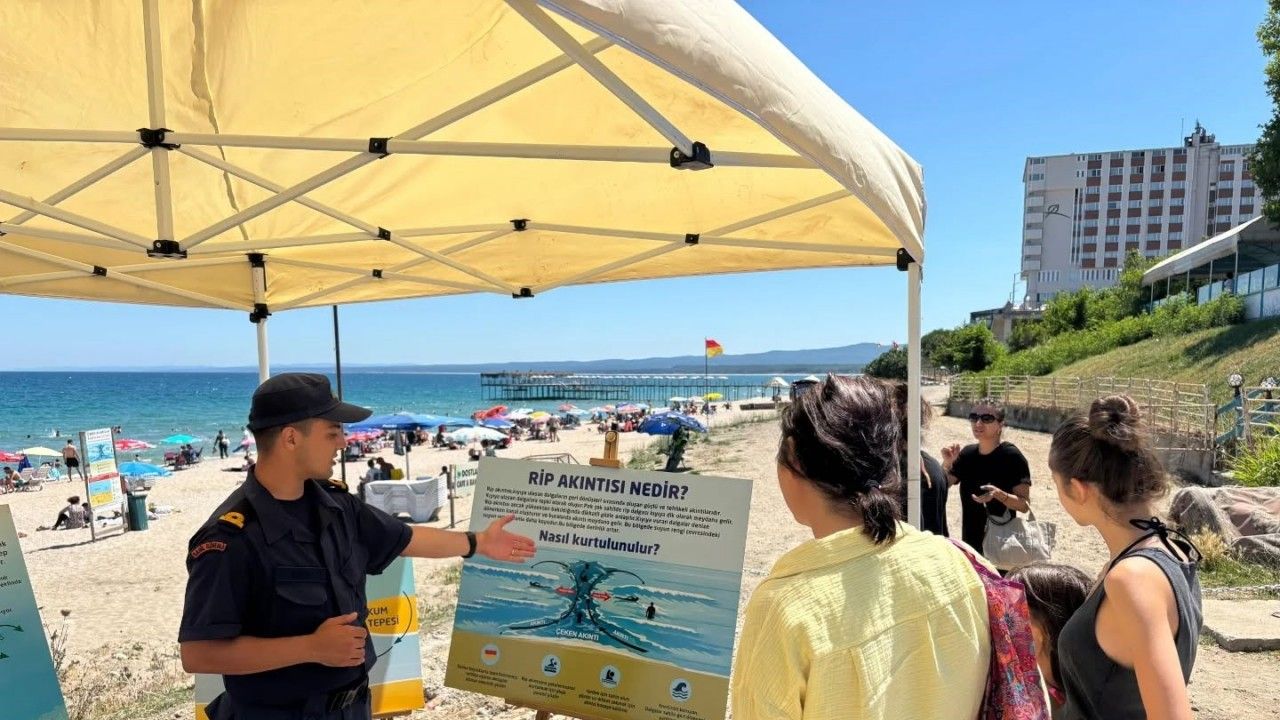 Kırklareli’nin Demirköy ilçesine bağlı İğneada beldesinde Sahil Güvenlik Karakol Komutanlığı ekipleri, halk plajına stant kurdu. Ekipler yerli ve yabancı turistleri boğuma vakalarına karşı rip akıntısı konusunda bilgilendirerek broşür dağıttı.
