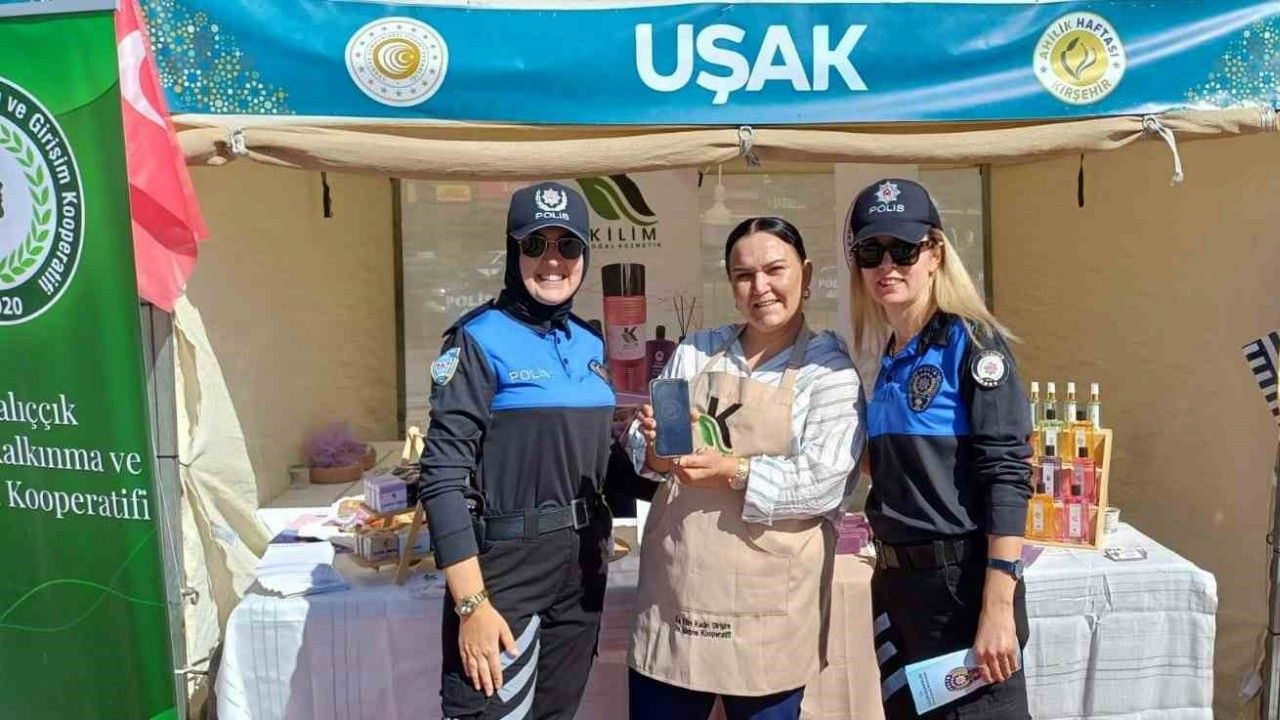 KIRŞEHİR (İHA) – Kırşehir İl Emniyet Müdürlüğü ekipleri; 38. Ahilik Haftası kutlamaları kapsamında düzenlenen ’Kadın Kooperatifleri Fuarı’nda kadınlara Kadın Destek Uygulaması (KADES) hakkında bilgilendirmede bulundu.
