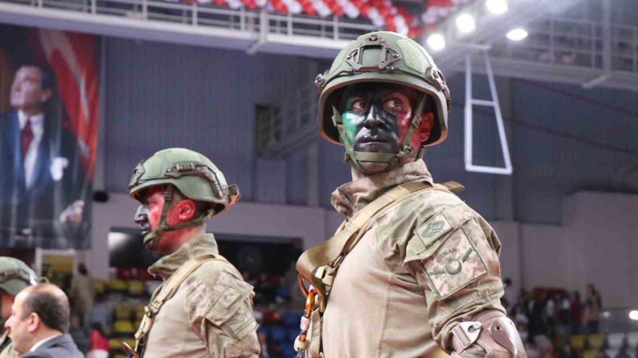 Bolu’da 19 Mayıs salon programında komandolar, yaklaşık 10 metre yüksekten Türk bayrağı ve Atatürk posteriyle salona iniş gerçekleştirdi. Gösteri dakikalarca alkışlandı.