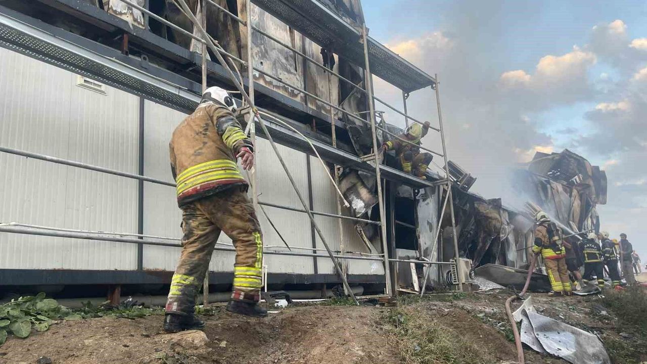 Hatay'da şantiye işçilerinin kaldığı konteyner yatakhane alevlere teslim olarak kullanılmaz hale geldi.