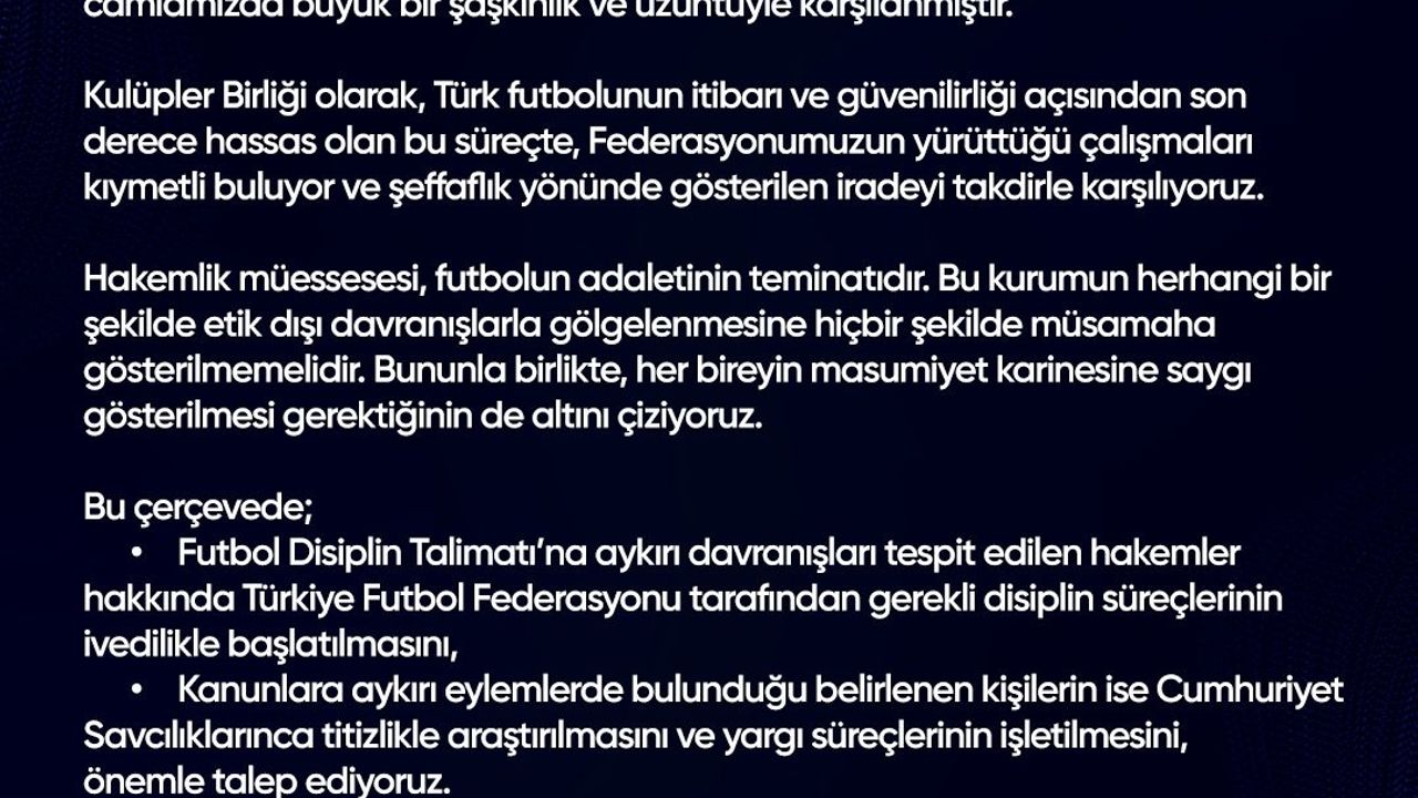 Kulüpler Birliği olarak, Türk futbolunun temiz, adil ve güvenilir bir zeminde ilerlemesi için sürecin hem destekçisi hem de takipçisi olacağımızı kamuoyunun bilgisine sunarız."