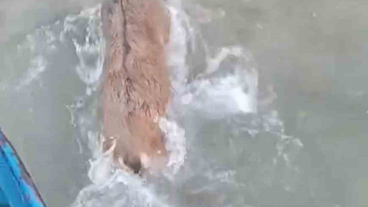 Elazığ’da kurtlardan kaçarken Keban Baraj Gölü’ne düşen dağ keçisini balıkçılar tekneyle kurtardı.