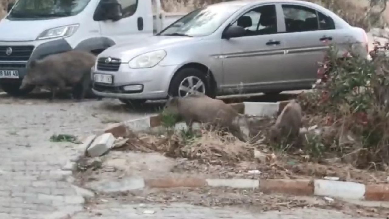 Aydın’ın Kuşadası ilçesinde aç kalan yaban domuzları şehir merkezine indi. Yaban domuzları şehir merkezine gelip sitelerin ara sokaklarında dolaştı. Çöp konteynerlerini karıştıran yaban domuzlarının yiyecek aradığı görüldü. Yavrularıyla birlikte sürü halinde sokaklarda dolaşan yaban domuzları otomobillerin arasında rahatça kimseye aldırış etmeden gezindi. O anlar ise çevre sakinlerinin cep telefonu kamerasına yansıdı. Görüntüde domuzların sokak aralarında yiyecek araması yer aldı.