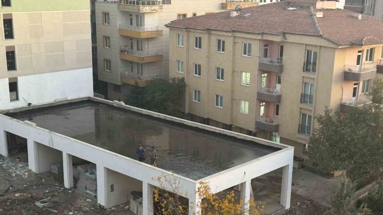 Malatya’nın Yeşilyurt ilçesinde rezerv alan olarak belirlenen bölgede inşaatı süren tek katlı iş yeri, yağışların ardından suyla dolarak adeta havuza döndü. Biriken suyun tahliyesi için duvara delik açılırken, iki işçi suyu boşaltmaya çalıştı. O anlar vatandaş kamerasına yansıdı.