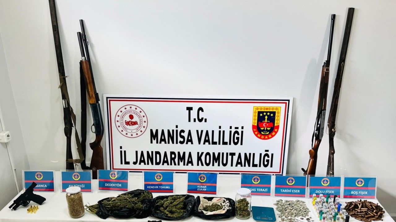 Manisa’nın Salihli ilçesinde jandarma ekipleri tarafından düzenlenen operasyonda uyuşturucu madde, tarihi eser, silah ve dedektörler ele geçirildi.