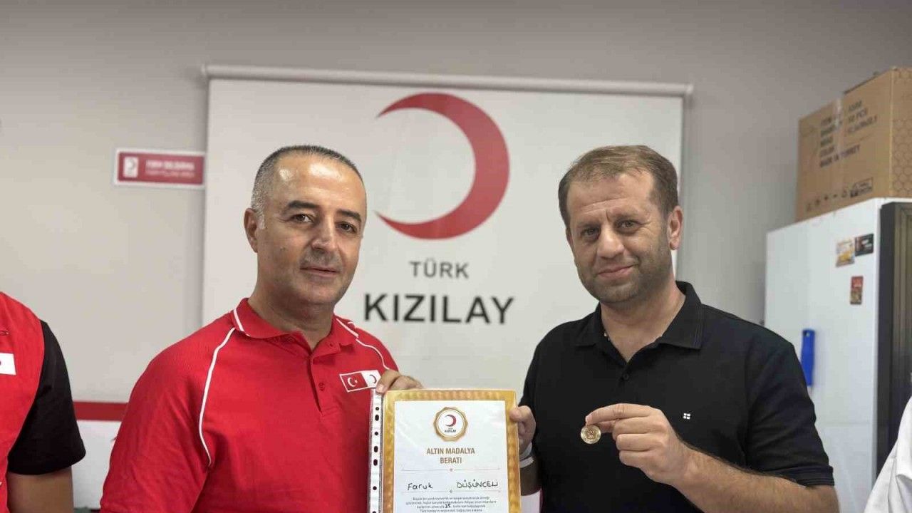 Kan bağışı sonrası Düşünceli’ye Kızılay tarafından altın kaplama madalya takdim edildi.