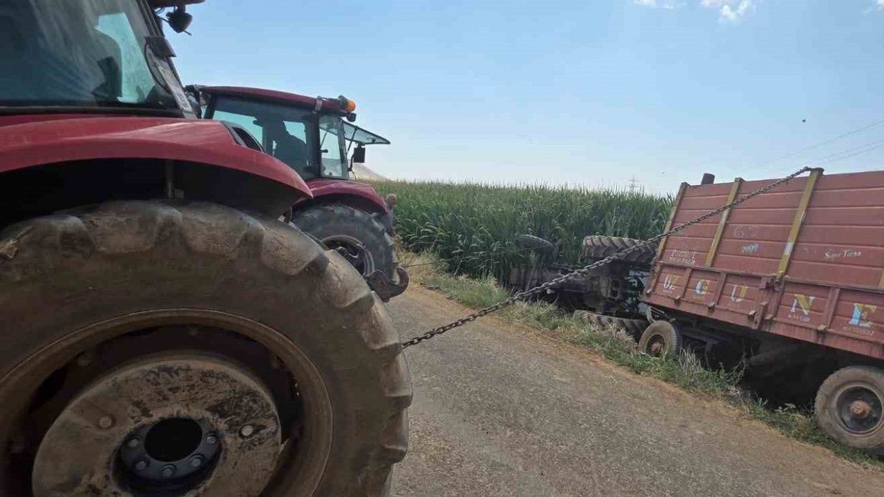 Mardin’in Mazıdağı ilçesinde sürücüsünün kontrolünden çıkan traktör, mısır tarlasına devrildi.