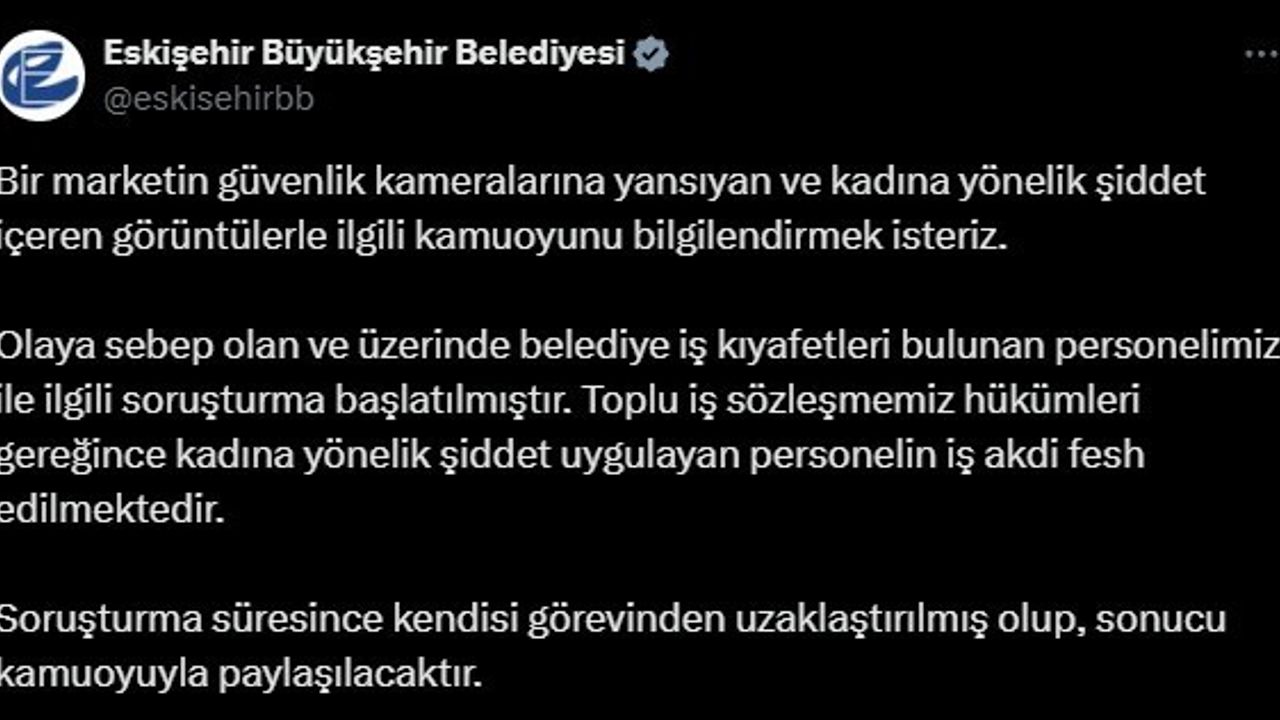 Eskişehir Büyükşehir Belediyesi tarafından yapılan açıklamada, "Bir marketin güvenlik kameralarına yansıyan ve kadına yönelik şiddet içeren görüntülerle ilgili kamuoyunu bilgilendirmek isteriz. Olaya sebep olan ve üzerinde belediye iş kıyafetleri bulunan personelimiz ile ilgili soruşturma başlatılmıştır. Toplu iş sözleşmemiz hükümleri gereğince kadına yönelik şiddet uygulayan personelin iş akdi feshedilmektedir. Soruşturma süresince kendisi görevinden uzaklaştırılmış olup, sonucu kamuoyuyla paylaşılacaktır" ifadelerine yer verildi.